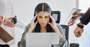 A person sitting at a desk looking worried or anxious while viewing a message on their laptop or phone.